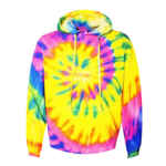 Dyenomite Adult 7.5 Ounce Multi-Swirl Hooded Pullover. 7.5 ounce, 80/20% cotton/poly sweatshirt with a jersey lined hood and matching drawstring. Ribbed knit cuffs and relaxed waistband. Side seamed body and double stitching throughout. Youth hoods do not have drawcords. Front pouch pocket.